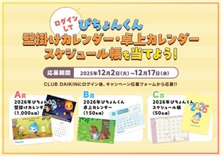 2025年12月17日(水)までのキャンペーン期間中に、公式サイトの特設ページにアクセスをした上でCLUB DAIKINに登録していない人は登録をした上で応募フォームから応募をすると、後日抽選で合計1,200名に『ダイキン 2026年 ぴっちょくん 壁掛けカレンダー or 卓上カレンダー or スケジュール帳』が当たる、プレゼントキャンペーンとなっています。