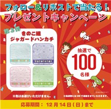 2025年12月14日(日)までのキャンペーン期間内に、公式アカウントをフォローした上で、キャンペーン期間中に対象ポストをリポストすると、後日抽選で100名に『きのこ組 ジャガード ハンカチ』が当たる、プレゼントキャンペーンとなっています。