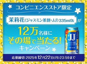 2025年12月22日(月)までのキャンペーン期間中に、特設ページへアクセスをしてLINEログインをして、簡単なアンケートに答えて応募をすると、その場で抽選で120,000名に『サントリー サントリー茉莉花〈ジャスミン茶割・JJ〉コンビニ無料引換券』が当たる、プレゼントキャンペーンとなっています。