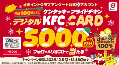 2025年12月18日(木)までのキャンペーン期間内に、公式アカウントをフォローした上で、期間中に投稿される対象ポストをリポストすると、後日抽選で100名に『KFCカード 最大5,000円分 + dポイント100ポイント』が当たる、プレゼントキャンペーンとなっています。