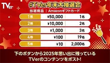 2025年12月17日(水)までのキャンペーン期間内に、公式アカウントをフォローした上で、期間中に毎日投稿される対象ポストのボタンから【思い出のTVerコンテンツ】を記入してポストすると、後日抽選で合計2,025名に『Amazonギフト券 10円分 ~ 50,000円分』が当たる、プレゼントキャンペーンとなっています。