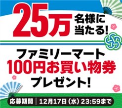 2025年12月17日(水)までのキャンペーン期間中に、公式X (Twitter)アカウントをフォローして、毎日投稿される対象ポストをリポストして、対象ポストのURLから応募をすると、その場で抽選で250,000名に『ファミリーマート100円お買い物券』が当たる、プレゼントキャンペーンとなっています。