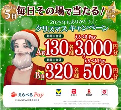 2025年12月19日(金)までの期間中に、公式X (Twitter)アカウントをフォローして、キャンペーン期間中に毎日投稿される対象ポストをリポストすると、その場で抽選で合計450名に『えらべるPay 500円分 or 3,000円分』が当たる、プレゼントキャンペーンとなっています。