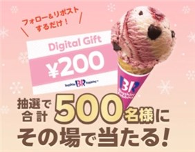 2025年12月26日(金)までのキャンペーン期間内に、公式アカウントをフォローした上で、キャンペーン期間中に毎日投稿される対象ポストをリポストして、アプリ内にあるURLから応募をすると、その場で抽選で500名に『サーティワンアイスクリーム ギフト券 200円分』当たる、プレゼントキャンペーンとなっています。