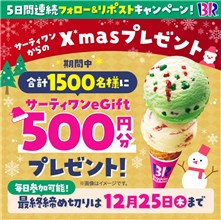 2025年12月25日(木)までのキャンペーン期間内に、公式X (Twitter)アカウントをフォローして、キャンペーン期間中に毎日投稿される対象ポストをリポストすると、後日抽選で1,500名に『サーティワンアイスクリーム ギフト券 500円分』が当たる、プレゼントキャンペーンとなっています。