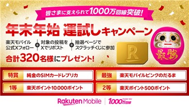 格安料金プラン・格安スマホ会社の【楽天モバイル】の公式X (Twitter)で「楽天モバイル 年末年始運試しキャンペーン」が開始しています。