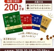 終了済みキャンペーン・懸賞フォロー&RTで200名に『職人の珈琲飲みくらべセット ワンドリップ4種各1杯分』が当たる!2025年10月【UCC・X(Twitter)キャンペーン】 コーヒーなどの販売で有名な【UCC上島珈琲】の公式X (Twitter)アカウントで「職人の珈琲ワンドリップ飲みくらべキャンペーン」が実施中です。 2025年10月19日(日)までのキャンペーン期間中に、公式アカウントをフォローして、...2025/10/18 [6:30]終了済みキャンペーン・懸賞