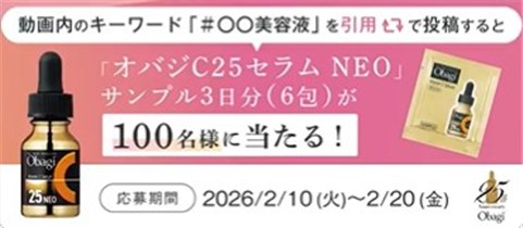 2026年2月20日(金)までのキャンペーン期間内に、公式Xアカウントをフォローして、キャンペーン対象ポストにハッシュタグ【#直送美容液】を付けて引用ポストすると、後日抽選で100名に『オバジC25セラム NEO サンプル3日分(6包)』が当たる、プレゼントキャンペーンとなっています。