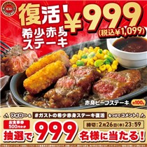 2026年2月26日(木)までの期間中に、公式アカウントをフォローして、キャンペーン期間中に毎日投稿される対象ポストにハッシュタグ【#ガストの希少赤身ステーキ復活】とコメントを記入して引用ポストすると、後日抽選で999名に『すかいらーくグループ お食事券 500円分』が当たる、プレゼントキャンペーンとなっています。