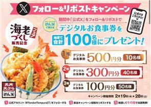 天丼・天ぷら販売チェーン店舗を全国展開している【さん天】の公式Xアカウントで「海老づくしフェア販売記念キャンペーン」が実施中です。