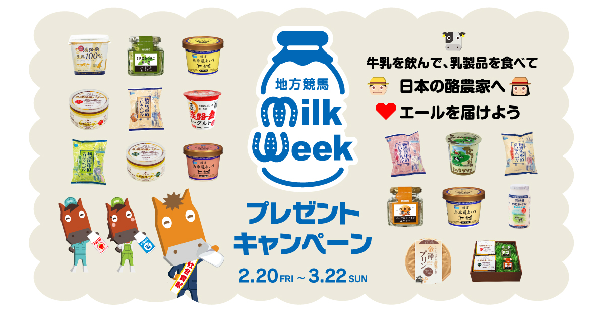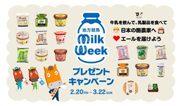 馬をはじめとする家畜とのふれあい、畜産及び畜産物の普及啓発を図ることを目的とした組織の【馬事畜産振興協議会】の特設ページで「地方競馬ミルクウィーク2026 プレゼントキャンペーン」が実施中です。