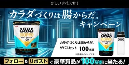 2026年4月20日(月)15時までのキャンペーン期間内に、公式アカウントをフォローして、キャンペーン期間中に投稿される対象ポストをリポストすると、後日抽選で100名に『カラダづくりは腸からだ。ザバスセット』が当たる、プレゼントキャンペーンとなっています。