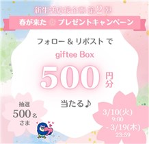2026年3月2日(月)までのキャンペーン期間内に、公式アカウントをフォローした上で、キャンペーン期間中に投稿される対象ポストをリポストすると、後日抽選で1,000名に『giftee Box 500円分』が当たる、プレゼントキャンペーンとなっています。