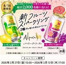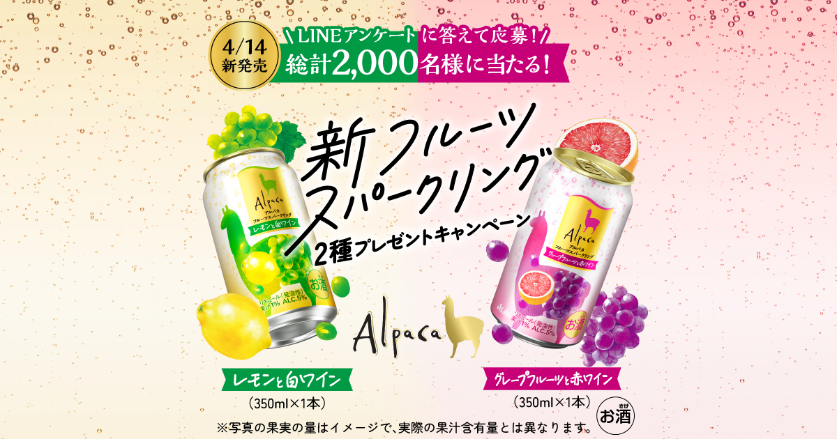 2026年3月12日(木)17時までのキャンペーン期間内に、特設ページにアクセスをした上で応募ボタンからアンケートに回答して応募をすると、後日抽選で2,000名に『アルパカフルーツスパークリング2本セット』が当たる、プレゼントキャンペーンとなっています。