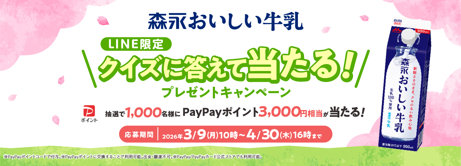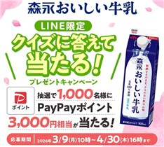 2026年4月30日(木)16時までのキャンペーン期間中に、特設ページにアクセスをして、応募ボタンから森永乳業公式アカウントを友達に追加して、アンケートページに回答をすると、後日抽選で1,000名に『PayPayポイント 3,000円相当』が当たる、アンケートキャンペーンとなっています。