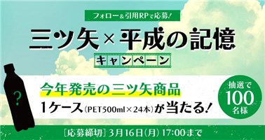 2026年3月16日(月)17時までの期間中に、公式アカウントをフォローして、キャンペーン対象ポストにあなたの平成×三ツ矢エピソードを記入して引用ポストすると、後日抽選で100名に『今年発売の三ツ矢商品 1ケース』が当たる、プレゼントキャンペーンとなっています。