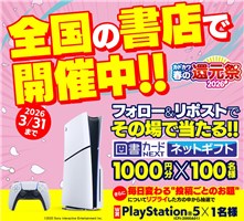 2026年3月31日(土)までのキャンペーン期間内に、公式アカウントをフォローした上で、キャンペーン期間中に毎日投稿される対象ポストをリポストすると、その場で抽選で100名に『図書カードネットギフト 1,000円分』が、後日抽選で1名に『PS5本体』が当たる、プレゼントキャンペーンとなっています。