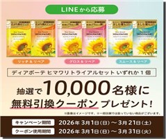 2026年3月21日(土)までのキャンペーン期間内に、公式LINEアカウントを友だちに追加した上で、トーク画面のリッチメニューからバナーをタップして応募をすると、その場で抽選で10,000名に『ディアボーテ ヒマワリトライアルセット 3種から1つ サンドラッグ無料引換券』が当たる、プレゼントキャンペーンとなっています。