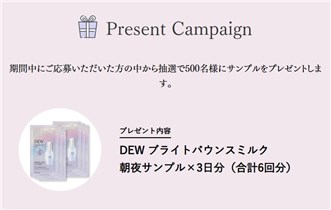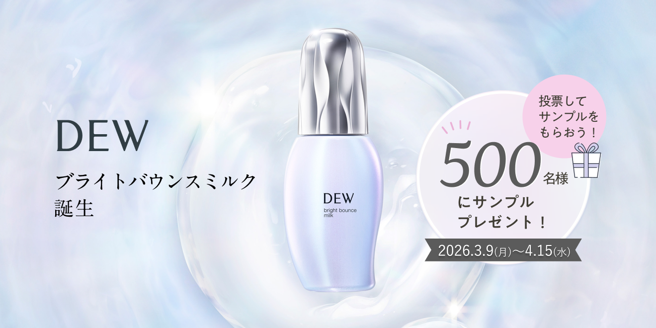 2026年4月15日(水)17時までのキャンペーン期間内に、特設ページにアクセスをして投票をした上で応募フォームから、簡単なアンケートに答えて必要事項を記入して応募をすると、後日抽選で500名に『DEW ブライトバウンスミルク 朝夜サンプル×3日分』が当たる、サンプルプレゼントキャンペーンとなっています。