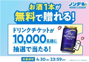 2026年4月30日(木)までのキャンペーン期間内に、特設ページにアクセスをした上で応募フォームから応募をすると、その場で抽選で10,000名に『サントリーのお酒1本を贈れる ノンデネのドリンクチケット』が当たる、プレゼントキャンペーンとなっています。