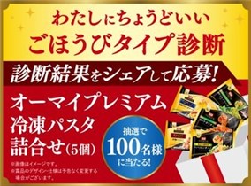 2026年4月30日(木)までの期間中に、公式アカウントをフォローして、キャンペーン対象ポストのURLから診断をして結果をシェアをすると、後日抽選で100名に『オーマイプレミアム 冷凍パスタ詰め合わせ 5個』が当たる、プレゼントキャンペーンとなっています。