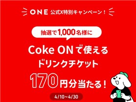 2026年4月30日(木)までのキャンペーン期間内に、公式アカウントをフォローした上で、キャンペーン対象ポストをリポストして、アプリ内から応募すると、その場で抽選で1,000名に『CokeONドリンクチケット』が当たる、プレゼントキャンペーンとなっています。
