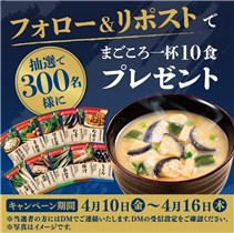 2026年4月16日(金)までのキャンペーン期間内に、公式アカウントをフォローして、キャンペーン期間中に投稿される対象ポストをリポストすると、後日抽選で300名に『まごころ一杯おみそ汁 10食』が当たる、プレゼントキャンペーンとなっています。