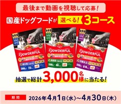 2026年4月30日(木)までのキャンペーン期間内に、特設ページにアクセスをした上で動画を視聴してアンケートに回答して応募をすると、後日抽選で合計3,000名に『ビューティプロ ドッグ パウダフル 3種から1つ (ドックフード)』が当たる、プレゼントキャンペーンとなっています。