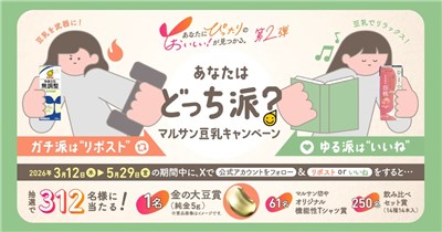 豆乳や味噌などの販売で有名な【マルサンアイ】の公式Xアカウントで「あなたにぴったりのおいしい!が見つかる。あなたはどっち派?マルサンキャンペーン」が実施中です。
