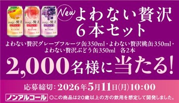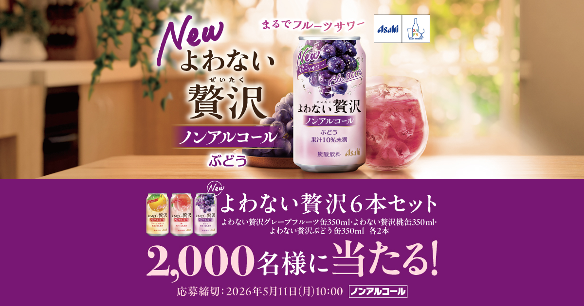 2026年5月11日(月)10時までのキャンペーン期間内に、特設ページにアクセスをした上で応募ボタンからアンケートに回答して応募をすると、後日抽選で2,000名に『アサヒ よわない贅沢 6本セット』が当たる、プレゼントキャンペーンとなっています。