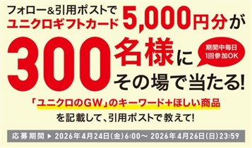 2026年4月26日(日)までのキャンペーン期間内に、公式Xアカウントをフォローして、期間中に毎日投稿される対象ポストに【#ユニクロのGW】とユニクロの商品で欲しい商品を記入して引用ポストすると、その場で抽選で300名に『ユニクロギフトカード 5,000円分』が当たる、プレゼントキャンペーンとなっています。