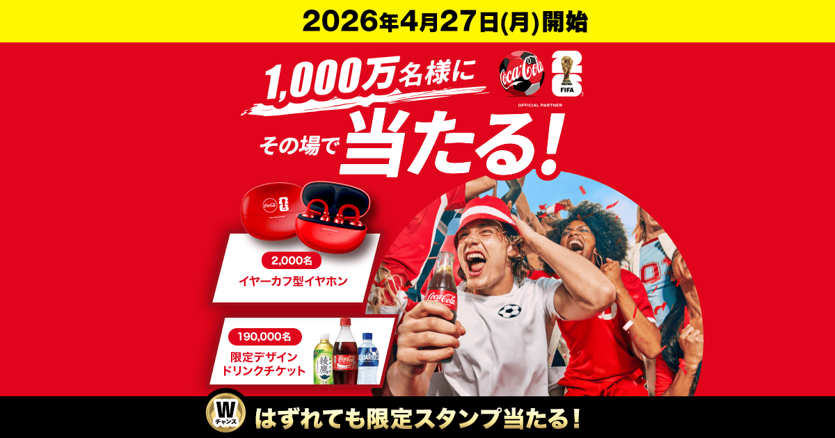 コカ・コーラの自販機アプリの【CokeONアプリ】で「FIFAワールドカップ 2026 限定デザイングッズなど1,000万名様にその場で当たる!キャンペーン」が開始しています。