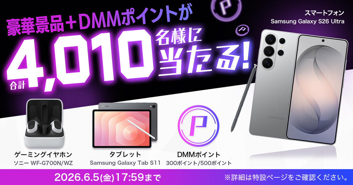 2026年6月5日(金)18時までのキャンペーン期間内に、公式サイトの特設ページの応募フォームからエントリーをした上で対象ゲームを遊んでチケットを貯めて、欲しい商品を選んで応募をすると、後日抽選で合計4,010名に『DMMポイント 300ポイント や 500ポイント』が当たる、プレゼントキャンペーンとなっています。