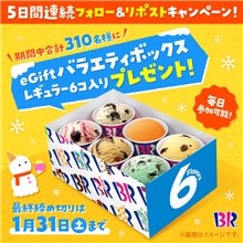 2026年1月31日(土)までのキャンペーン期間内に、公式アカウントをフォローした上で、キャンペーン期間中に毎日投稿される対象ポストをリポストすると、後日抽選で1,500名に『サーティワンアイスクリーム eギフト券 バラエティボックス (レギュラー) 6コ入り』が当たる、プレゼントキャンペーンとなっています。