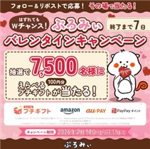 2026年2月14日(土)までのキャンペーン期間内に、公式アカウントをフォローした上で、キャンペーン期間中に毎日投稿される対象ポストをリポストすると、その場で抽選で7,500名に『えらべるプチギフト100円分』が当たる、プレゼントキャンペーンとなっています。