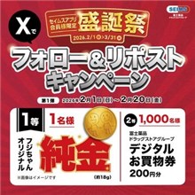 富士薬品グループのドラッグストアの【セイムス】の公式Xアカウントで「セイムスで純金が当たる!セイムスアプリ盛誕祭キャンペーン」が開始しています。