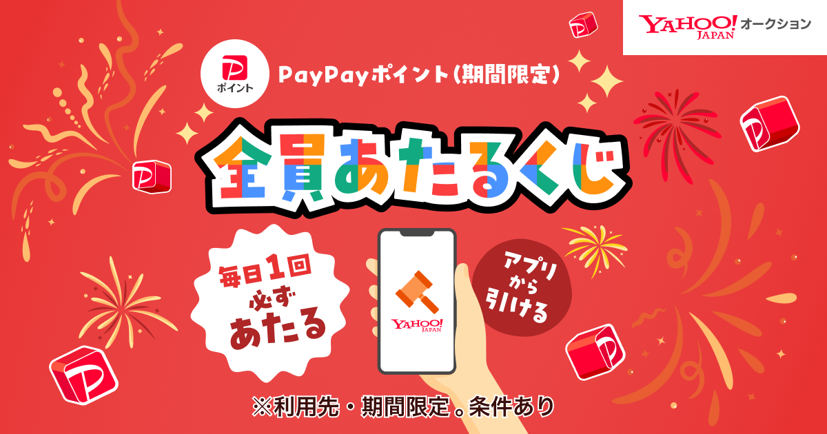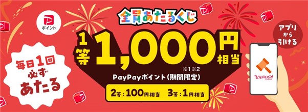 インタネットオークションアプリの【Yahoo!オークション】の公式アプリで「毎日1回ひける!全員あたるくじ キャンペーン【2025年12月~2026年1月】」が開催中です。