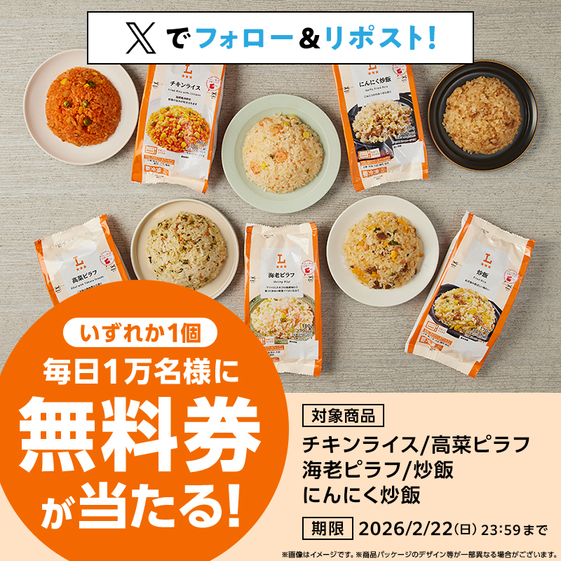 2026年2月22日(日)までの期間中に、公式アカウントをフォローして、キャンペーン期間中に毎日投稿される対象ポストをリポストすると、その場で抽選で毎日10,000名・期間中合計50,000名に『対象のローソンオリジナル冷凍米飯 無料引換券』が当たる、プレゼントキャンペーンとなっています。