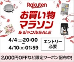 インターネットショッピングサイトの【楽天市場】で2026年4月4日(土)20時~お買い物マラソン【2026年4月】※エントリー必須が開始しています。