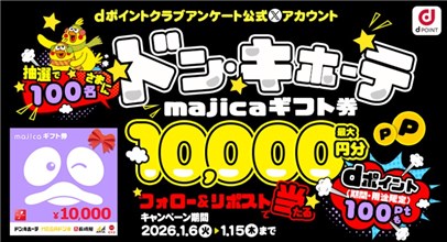 2026年1月15日(木)までの期間中に、公式アカウントをフォローして、キャンペーン対象ポストをリポストすると、後日抽選で100名に『majicaギフト券 最大1万円分 + dポイント 100ポイント』が当たる、プレゼントキャンペーンとなっています。