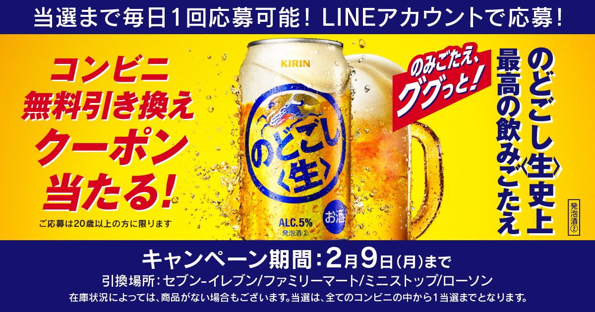 飲料や酒類を製造販売している【キリンビール】の公式LINEアカウントで「26年2月 のどごし<生> コンビニ無料引き換えクーポンが当たる!キャンペーン」が開始しています。
