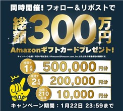 2026年1月22日(木)までのキャンペーン期間内に、公式アカウントをフォローして、期間中に投稿される対象ポストをリポストすると、後日抽選で合計213名に『Amazonギフト券 10,000円分 ~ 500,000円分』が当たる、プレゼントキャンペーンとなっています。