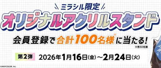 2026年2月24日(火)までのキャンペーン期間内に、公式サイトの特設ページにアクセスをして、ミラシル会員でない人は登録をした上で応募をすると、後日抽選で合計100名に『にじさんじ オリバー or ローレン アクリルスタンド』が当たる、プレゼントキャンペーンとなっています。