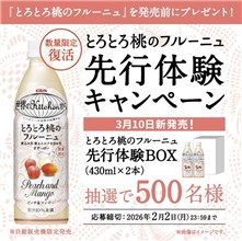 2026年2月2日(月)までの期間中に、公式アカウントをフォローした上で、期間中に投稿される対象ポストをリポストすると、後日抽選で500名に『キリン とろとろ桃のフルーニュ先行体験BOX (2本)』が当たる、プレゼントキャンペーンとなっています。