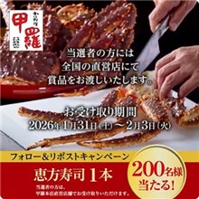2026年1月27日(火)までのキャンペーン期間内に、公式アカウントをフォローした上で、キャンペーン期間中に毎日投稿される対象ポストをリポストして、対象ポストのURLから応募をすると、その場で抽選で200名に『恵方寿司 1本 ※店頭受取』が当たる、プレゼントキャンペーンとなっています。