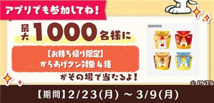 2026年3月9日(月)までのキャンペーン期間内に、アプリをダウンロードしていない人はアプリをインストールして、ステージ8までゲームを進めて、アプリ内のイベントからミッションをクリアして応募すると、その場で抽選で1,000名に『からあげクン 4種から1つ ローソン無料引換券』が当たる、プレゼントキャンペーンとなっています。