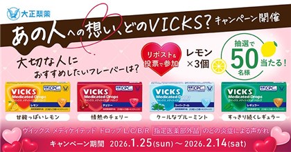 2026年2月14日(土)までのキャンペーン期間内に、公式アカウントをフォローして、キャンペーン対象ポストの選択肢からポストをすると、後日抽選で50名に『VICKSレモン20粒(のど飴) 3箱』が当たる、プレゼントキャンペーンとなっています。