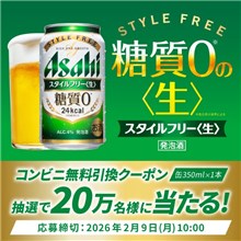 2026年2月9日(月)10時までのキャンペーン期間内に、特設ページにアクセスをした上で応募ボタンからアンケートに回答して動画を視聴して応募をすると、その場で抽選で合計200,000名に『アサヒスタイルフリー<生> 350ml缶 コンビニ無料引換券』が当たる、プレゼントキャンペーンとなっています。