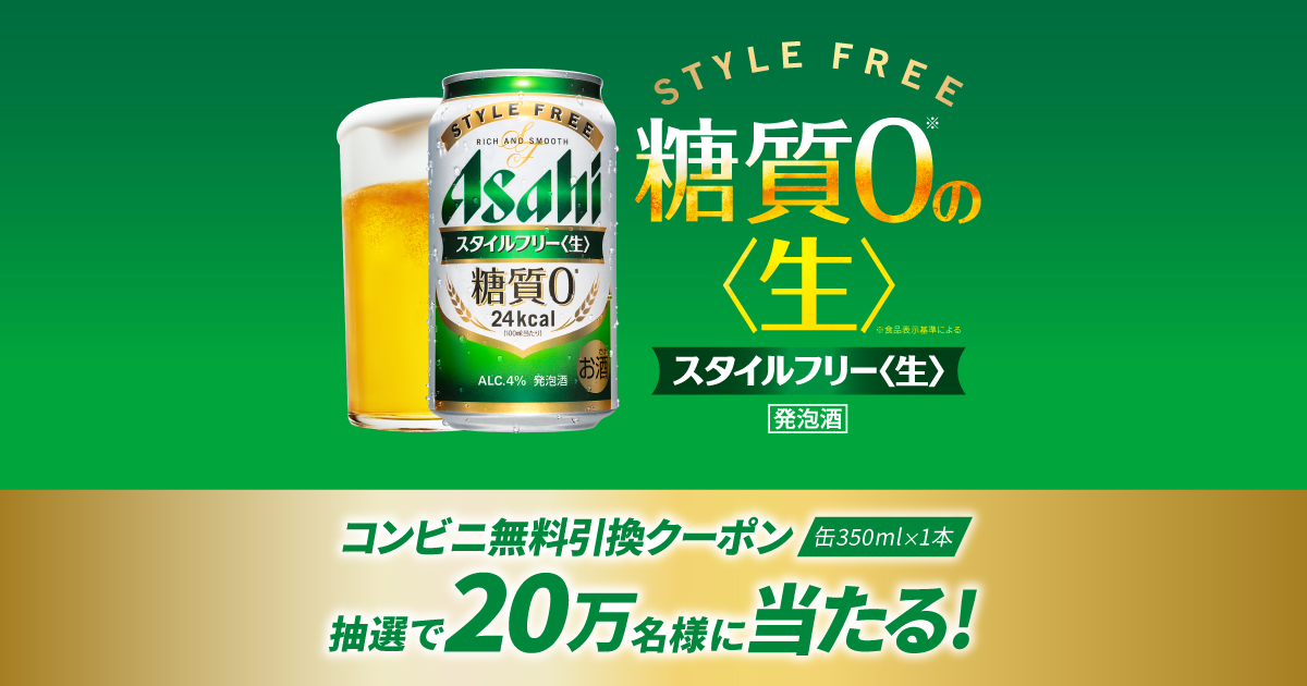 『アサヒスタイルフリー<生>』が200,000名様に当たる!コンビニ無料引換えクーポンプレゼントキャンペーン|アサヒビール