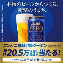 2026年2月24日(火)10時までのキャンペーン期間内に、特設ページにアクセスをした上で応募ボタンからアンケートに回答して動画を視聴して応募をすると、その場で抽選で合計205,000名に『アサヒゼロ 350ml缶 コンビニ無料引換券』が当たる、プレゼントキャンペーンとなっています。